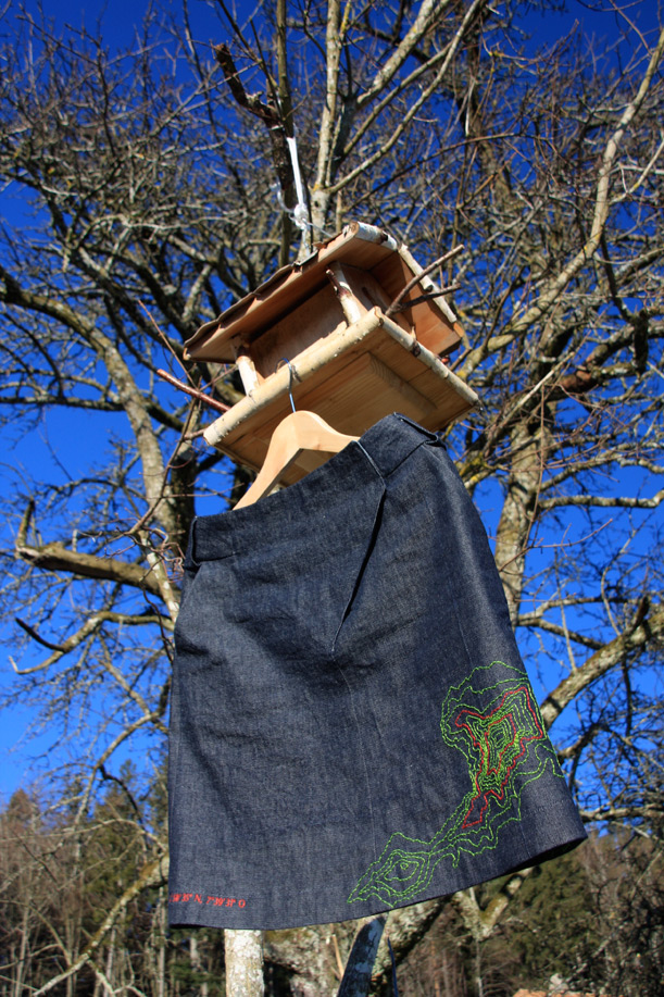 Jupeschnitte auswählen, ein schweizer Berge sowie den Stoff auswählen. Mir all diese Informationen sowie deine Maase angeben und drei bis vier Wochen später kommt dein selbst designtes Unikat per Post zu dir nach Hause. Das Nähen des Jupes geschieht in einem Atelier in Langenthal, die Höhenkurven werden von mir in Handarbeit appliziert.