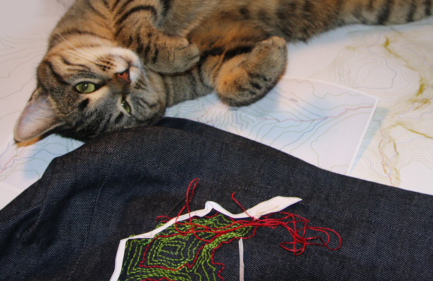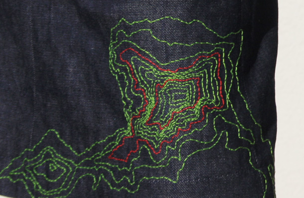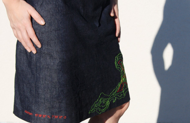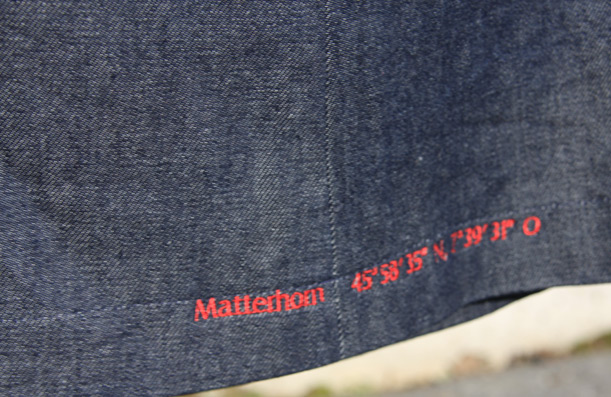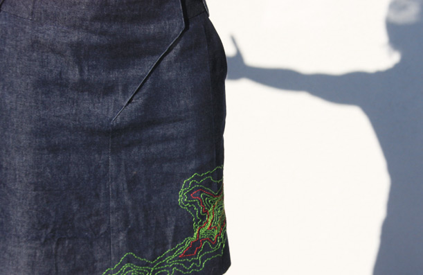 Die Idee zu diesem Jupe entstand auf einer Bergtour in Zermatt. Eine Sportart, welche lange Zeit von den Männern dominiert wurde. Aus diesem Grund nahm ich als Schnittmuster die Masse der ersten „kommerziell verkauften“ Wanderhosen ab und liess sie von einer Schnitt-Technikerin in ein Jupeformat modifizieren. Die Höhenkurven des Matterhorns erhielt ich vom geologischen Dienst in Zermatt. In Handarbeit applizierte ich den Berg, seinen Namen sowie die Längen – und Breitengrade auf den Rock.