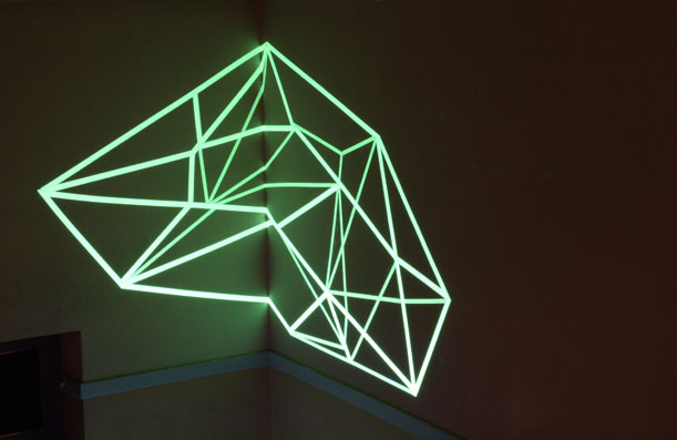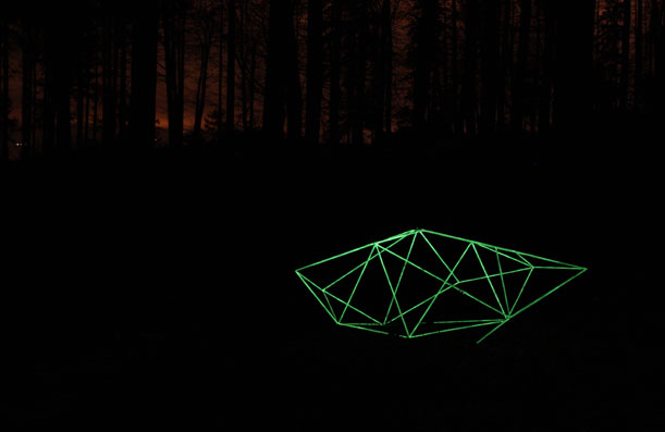 Für eine Ausstellung gestaltete ich ein 2D Leuchtobjekt in einem Hausgang. Von Weitem erweckte es den Eindruck einer räumlichen Installation. Für eine weitere Inszenierung wurde die Form des Wandobjektes in ein 3D Modell umgesetzt. Ein 1:100 Modell soll helfen, die vielen unterschiedlichen Längen, Winkel…zu berechnen und aufzuzeigen, um den Bau zu erleichtern. Anschliessend erfolgte eine Behandlung mit einer speziellen fluoriszierenden Materie.