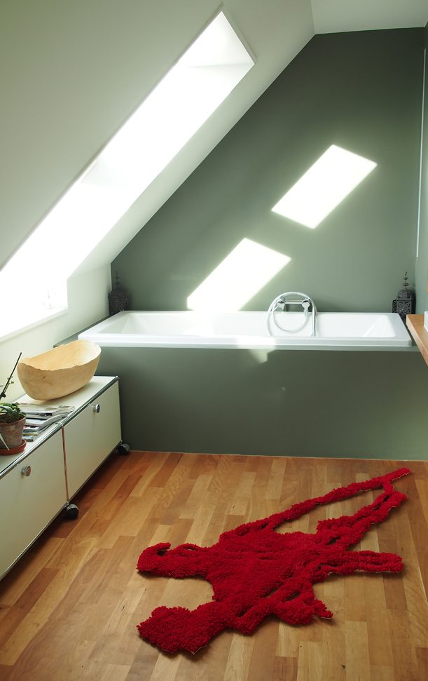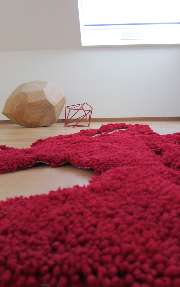 Die Form des Flughafen Zürich als handgeknüpfter Teppich – flauschig weich in Rot. Flughäfen gelten als Nichtorte. Für die meisten Menschen sind sie jedoch Orte des Wartens, der Freude, der Hoffnung, des Ankommens und des Abschiedes. Aber auch der Hektik. Bewusst habe ich daher den Teppich von Hand in stundenlanger Arbeit selber geknüpft und mich dabei gefragt, was ein Flughafen für mich bedeutet. Mehr Bilder unter News/Blog.