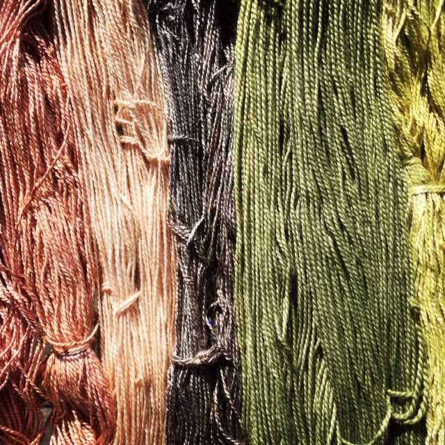 Am nächsten Tag konnte unsere Versuchsreihe starten. Die gut ausgewaschenen Woll- und Stoffstücke wurden gut nass gemacht und dann unterschiedlich lange in die zwei Sude gelegt. Ein Teil der Wolle haben wir nach dem Färben noch für eine Minute in Eisenbeize (selbst angesetzt mit rostigen Nägeln) getaucht und siehe da, auch dies generierte eine neue Farbe.