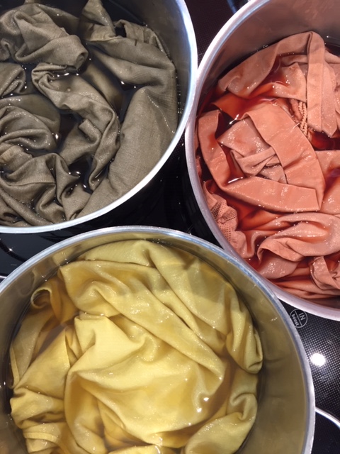 Wolle und Stoffe mit Pflanzen und Haushaltabfällen färben – geht dies? Zusammen mit einer Kollegin haben wir erste Versuche gestartet. Zuerst haben wir die Wolle/Stoffe mit drei unterschiedlichen Laugen vorbehandelt – einerseits mit Sojamilch, mit Holzasche sowie mit Alaun. Den Sud mit Efeu (wächst bei mir zu Hause) und Avocadoschalen und Kernen haben wir einen Tag vor dem Färben angesetzt, zwei Stunden köcheln lassen und danach über Nacht stehen lassen.