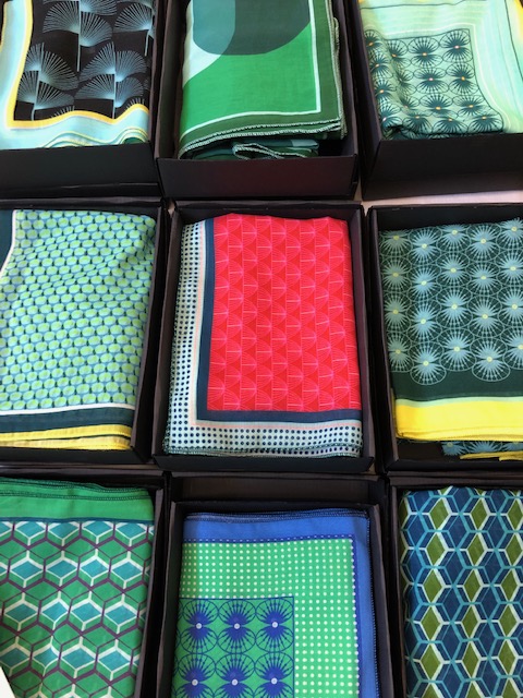Sechs Muster in unterschiedlichen Farben, je nur 2 bis maximal 3 Stück von jedem Schal zum Preis von 169.-Die Baumwolle/Seidenqualität kann gut gewaschen und gebügelt werden, ist leicht und gibt doch schön war. Zu erwerben bei: