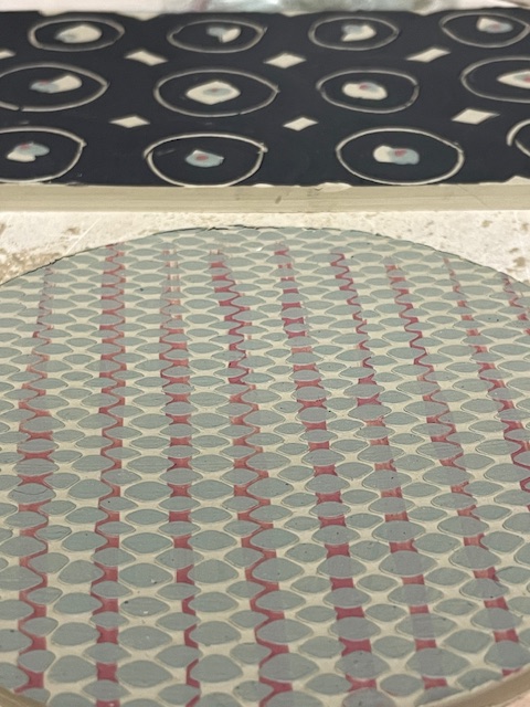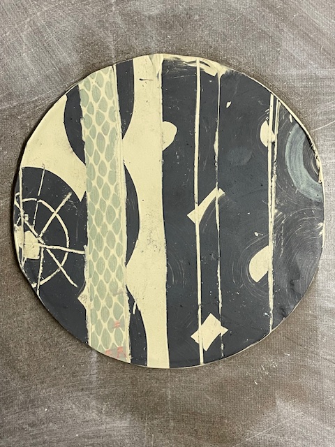 Ich bin immer noch in der Experimentierphase. Jedes Mandarinennetz, jeder gelochte Karton etc wird als mögliche Druckvorlage verwendet. Wie auf dem Papier wird der Ton nach dem Bedrucken in Streifen geschnitten und neu zusammen gesetzt – es hat was von puzzeln. Schieben, drehen…bis es mir gefällt. So wir jedes Stück automatisch zum Unikat, was mir gefällt. Hier einige Bilder zum Entstehungsprozess.